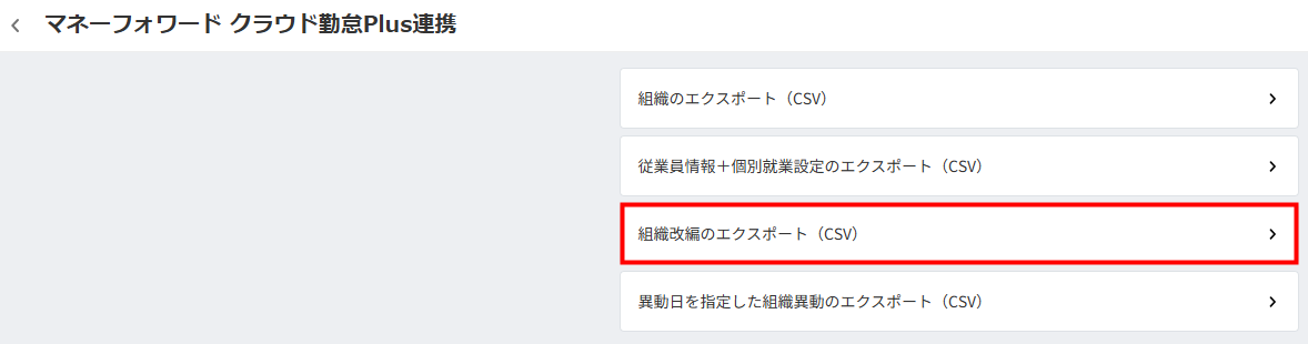 - 「マネーフォワード クラウド勤怠Plus連携」画面で「組織改編のエクスポート(CSV)」をクリックします。
