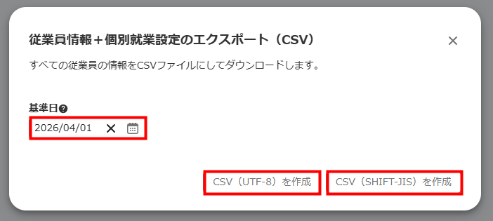- 「従業員情報+個別就業設定のエクスポート(CSV)」画面で「基準日」を選択し、「CSV(UTF-8)を作成」または「CSV(SHIFT-JIS)を作成」をクリックします。