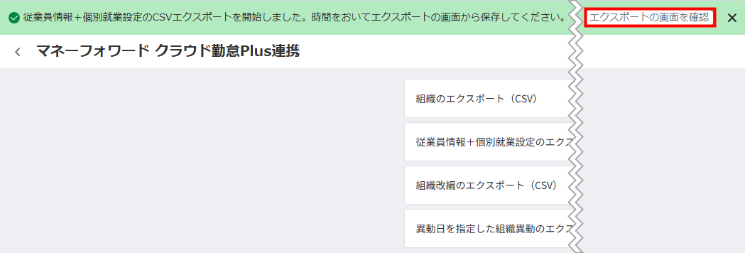 - 画面上部に「従業員情報+個別就業設定のCSVエクスポートを開始しました。」というメッセージが表示されたことを確認します。