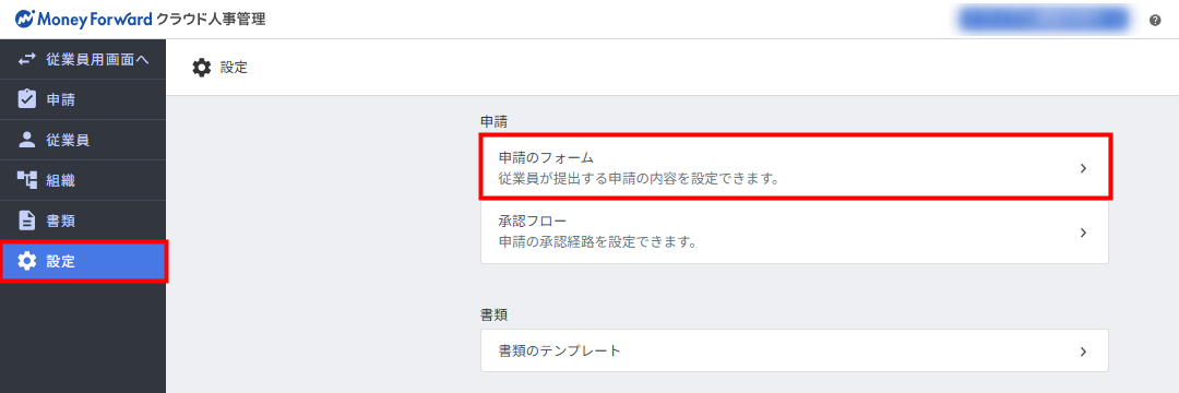 - 左メニューの「設定」をクリックし、「設定」画面で「申請」の「申請のフォーム」を選択します。