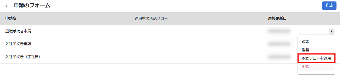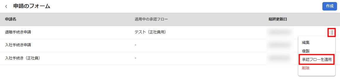 - 「申請のフォーム」画面で「申請名」の右側にある縦三点リーダーをクリックし、「承認フローを適用」を選択します。