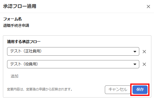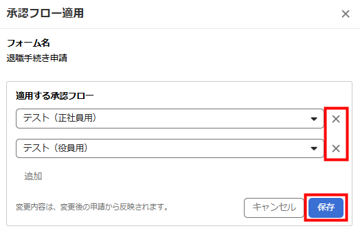 - 解除する承認フローの右横のバツ印をクリックし、「保存」を選択します。