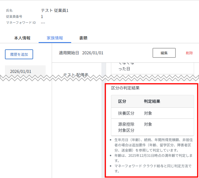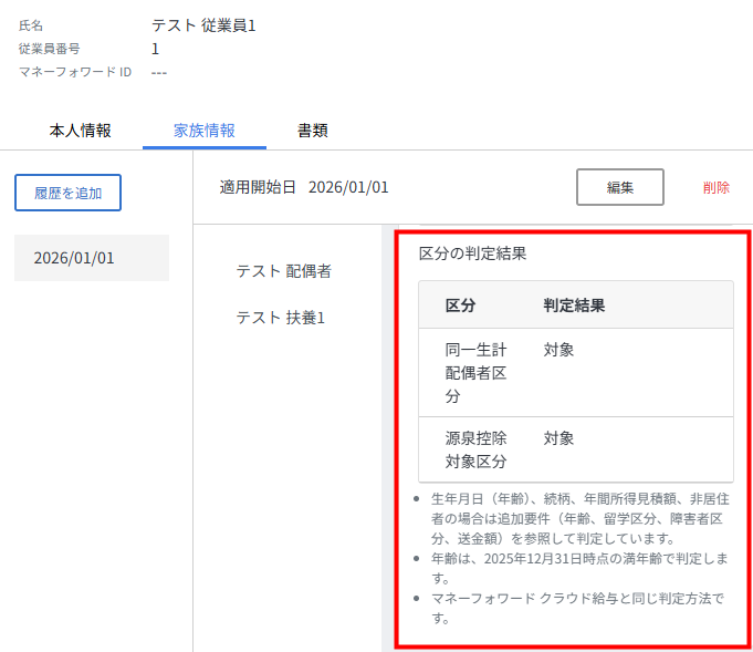 「従業員」画面の「家族情報」タブにて、「同一生計配偶者区分」「扶養区分」「源泉控除対象区分」の判定結果が表示されるようになりました。
