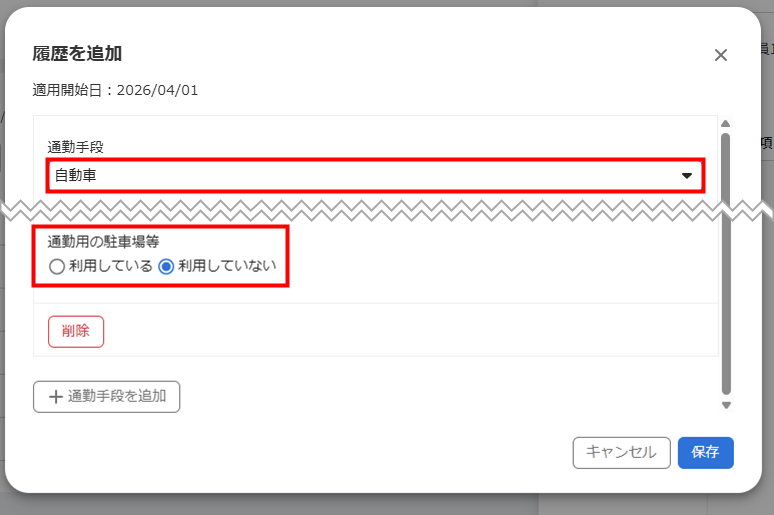 駐車場に関する項目は、「通勤手段」で「自動車」「バイク」「自転車」のいずれかを指定し、「通勤用の駐車場等」の「利用している」を選択することで登録できるようになります。