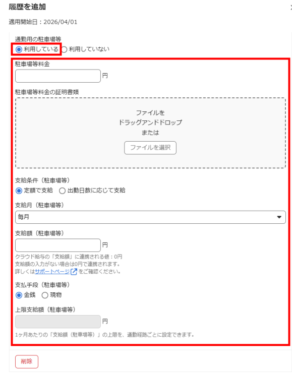 「利用している」を選択した場合は、必要に応じて「駐車場等料金」「駐車場等料金の証明書類」「支給条件(駐車場等)」等の項目を登録してください。