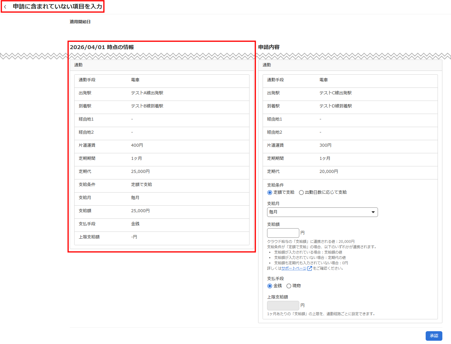 これにより、承認操作の時点で適用されている従業員情報を参照しながら、申請に含まれていない項目を入力できます。