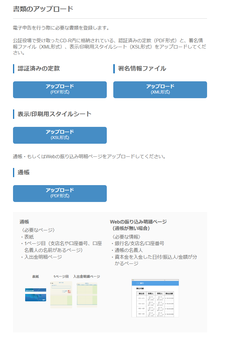 また、銀行口座に所定の資本金額を振り込んだことを証明するための書類として、通帳またはWebの振り込み明細ページ(PDF形式)をアップロードしてください。