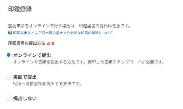 - 「印鑑登録」で印鑑届書の提出方法を選択します。<ご注意>