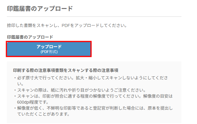 - 「印鑑届書のアップロード」で「アップロード」をクリックし、捺印した印鑑届書をアップロードします