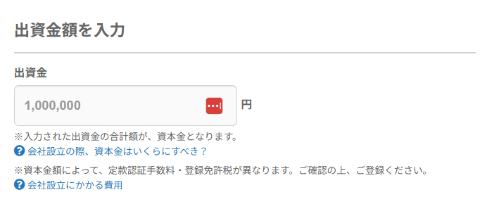 - 「出資金額を入力」に代表者の出資金額を入力します。