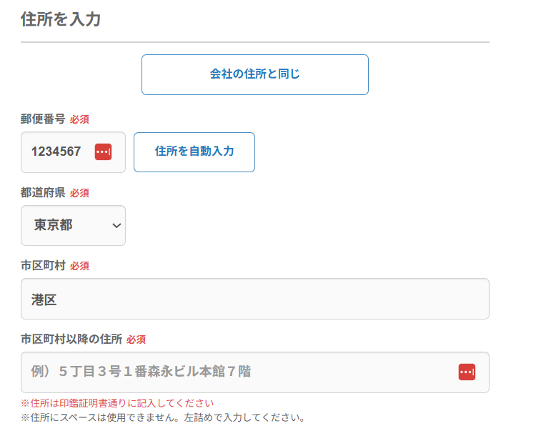 - 「住所を入力」で「代表情報」に入力した代表者の住所を入力します。会社の住所と同じ住所を入力する場合は、「会社の住所と同じ」をクリックしてください。