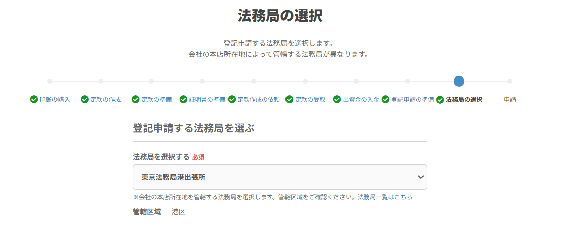 プルダウンには、「STEP1 会社名と所在地」画面で入力した住所をもとに管轄の法務局が表示されます。
