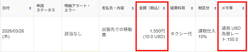 また、「メモ等」欄に通貨と為替レートが表示されます。