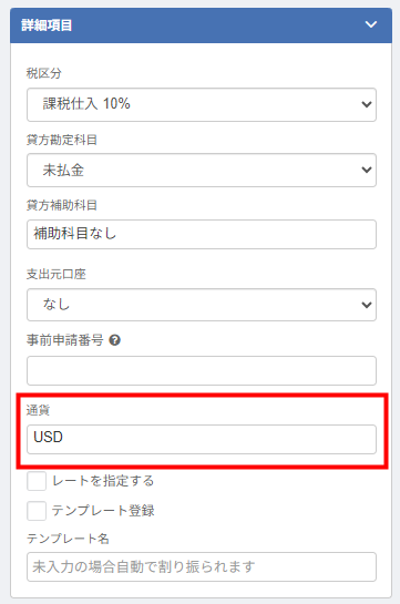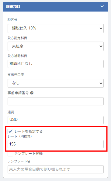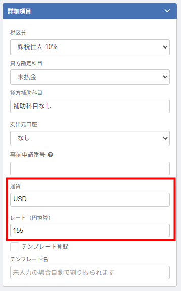 - 「詳細項目」の「通貨」で適切な通貨を選択し、「レート(円換算)」を入力します。