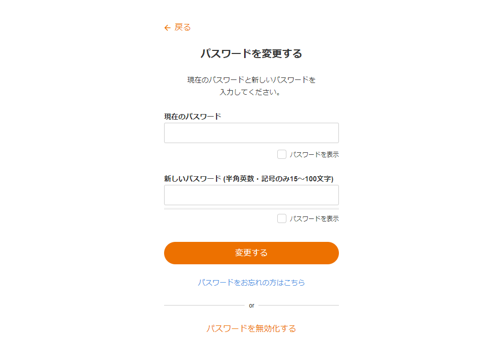 - 「パスワードを変更する」画面で「現在のパスワード」と「新しいパスワード」を入力し、「変更する」をクリックします。