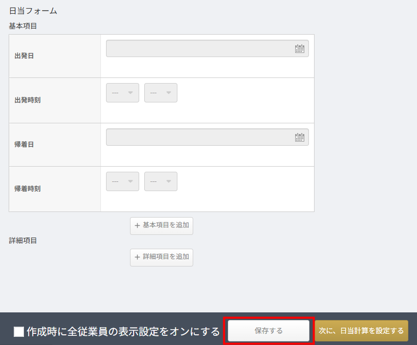 項目は「基本項目」と「詳細項目」の2種類あります。- 基本項目:日当の自動計算を行うに当たり、選択または入力してほしい項目をご設定ください。