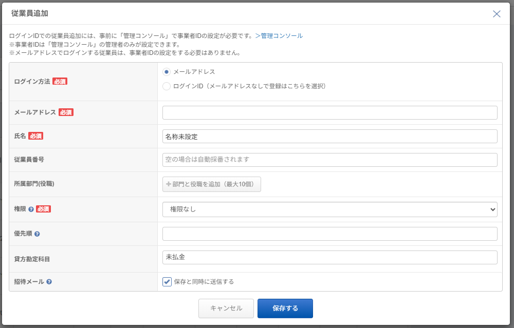 | 従業員番号 | 会計ソフトや基幹システムと連携する場合は、同じ従業員番号を登録します。 空白の場合は、自動で採番されます。 |