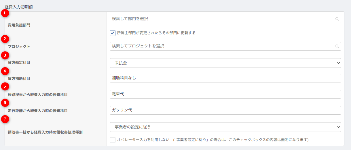 | ⑤ | 経路検索から経費入力時の経費科目 | 「経路から登録」で経費明細を登録するときに、初期値として表示される「経費科目」を選択します。 |