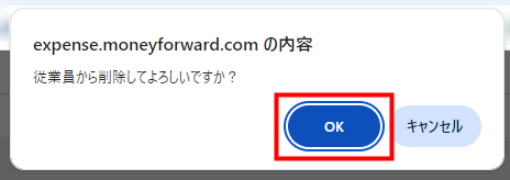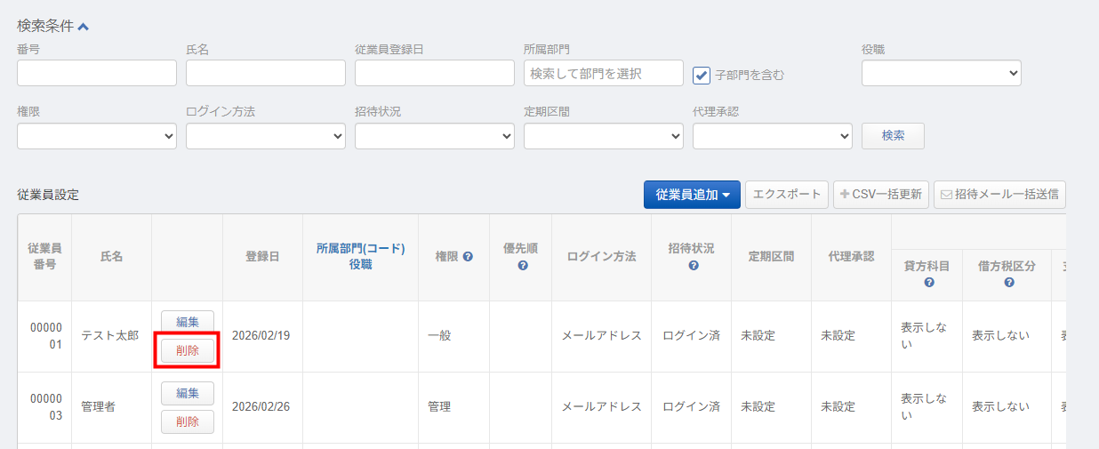 - 「従業員一覧」画面で、削除したい従業員の「削除」をクリックします。