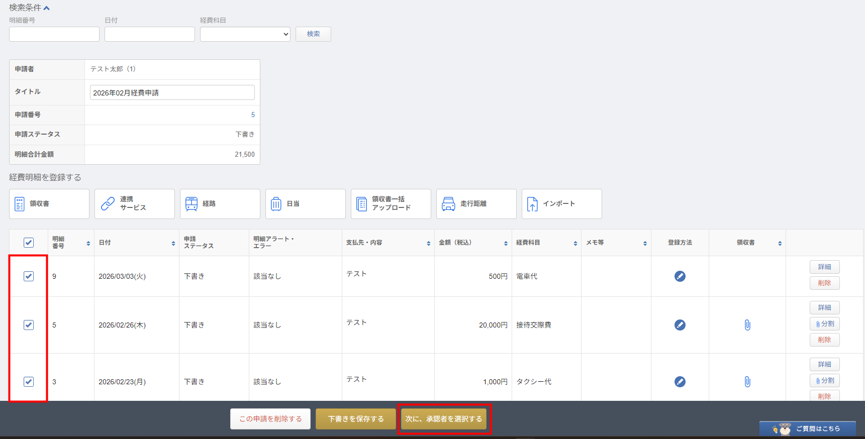 - 電車移動や備品購入などで経費の立て替えが発生したら、経費明細を作成し、ステップ1で作成した経費精算申請の下書きに追加します。