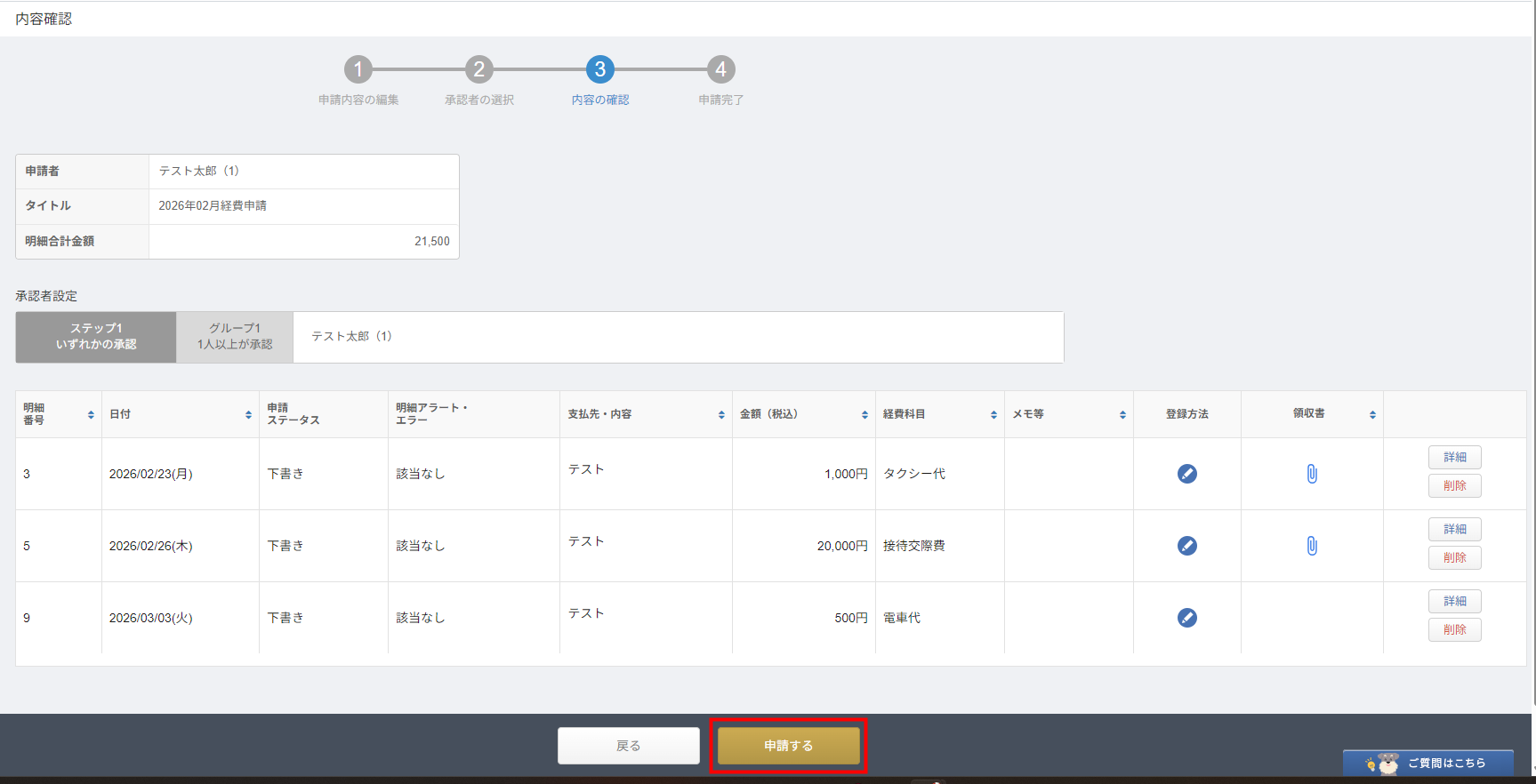 - 月末などの任意のタイミングで、ステップ2で作成した経費精算申請の下書きを申請します。