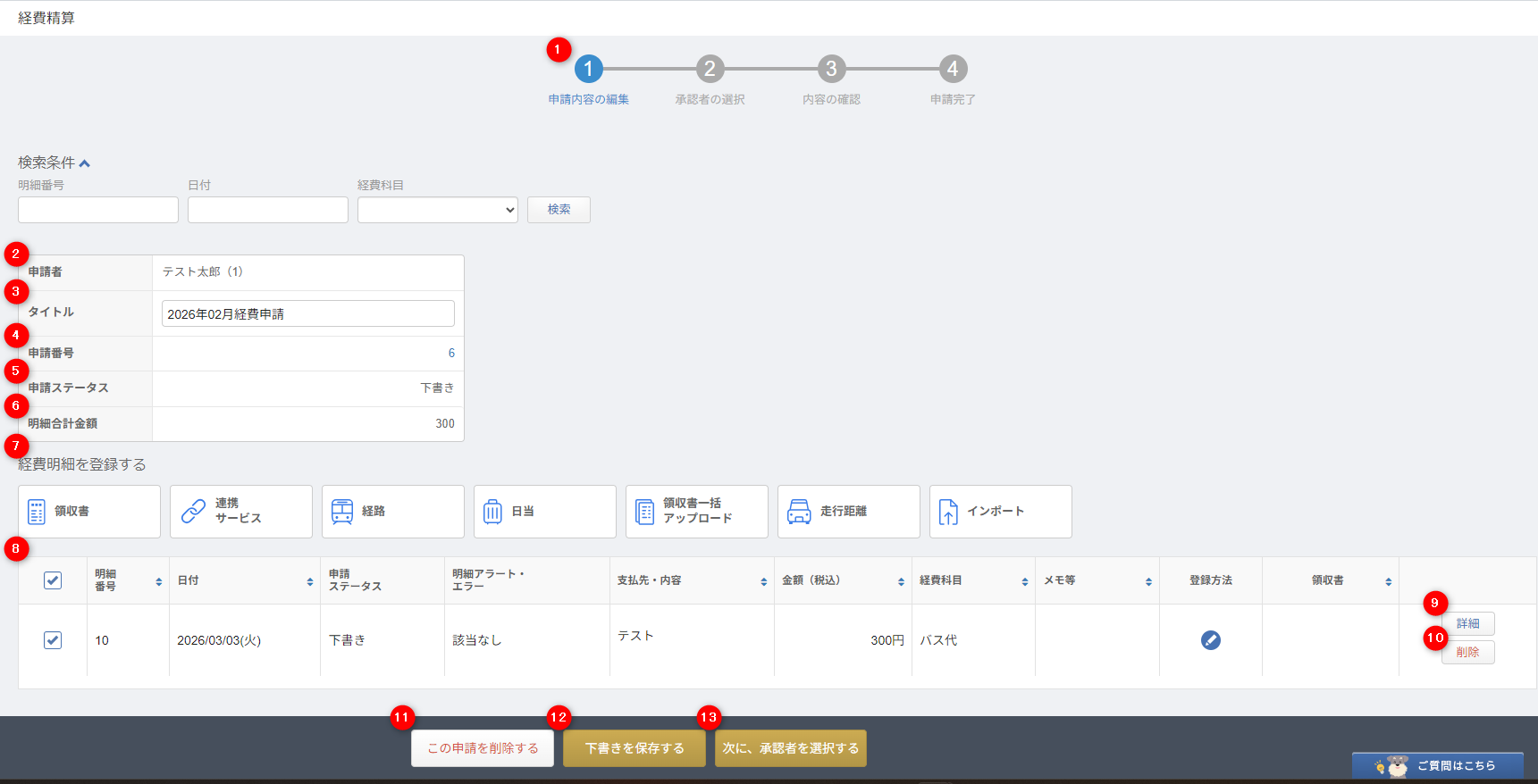 | ⑪ | この申請を削除する | クリックすると、表示中の申請を削除できます。 該当の申請に含まれる経費明細は削除されません。 |