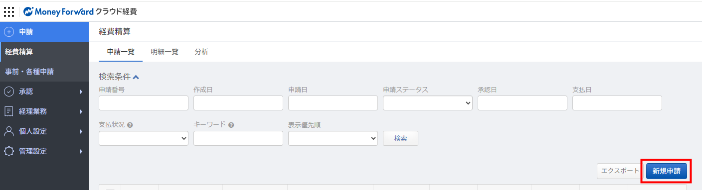 - 「申請」>「経費精算」>「申請一覧」画面で「新規申請」をクリックします。