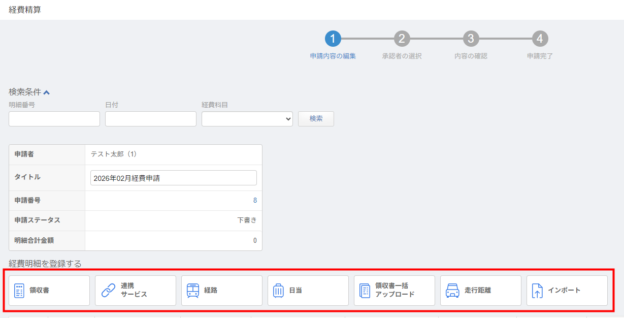 - 経費精算申請の下書きを作成し、空の申請を用意します。