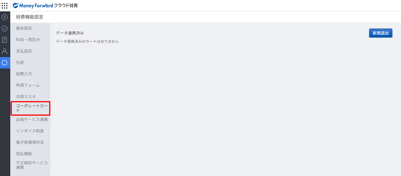 - 「管理設定」>「経費機能設定」>「コーポレートカード」をクリックします。