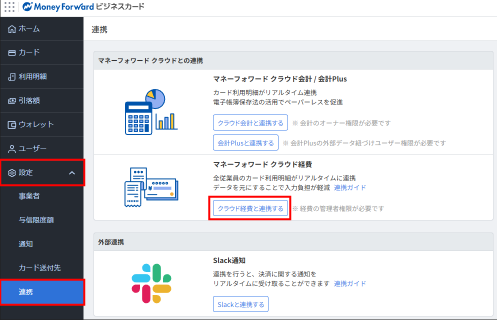※初回の連携設定については、「マネーフォワード ビジネスカード」「管理者」ロールが必要です。