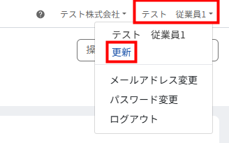 管理コンソールの「ユーザー」画面で「表示名」を変更したあと、クラウド人事管理の画面右上に表示されるユーザー名をクリックし、「更新」を選択してください。