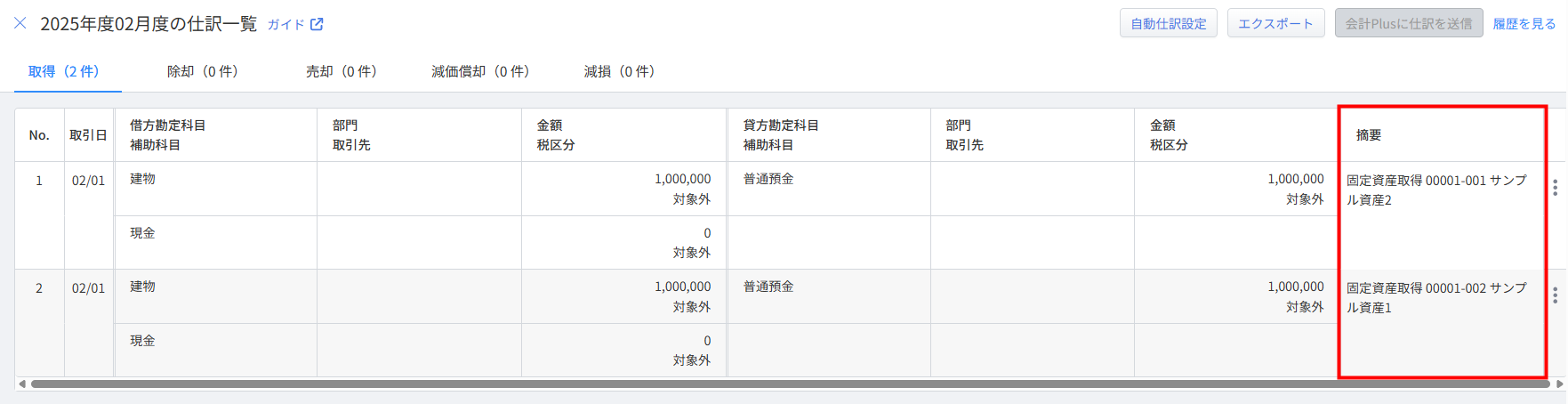 これにより、マネーフォワード クラウド固定資産で作成される仕訳の摘要に設定した内容が自動で反映します。