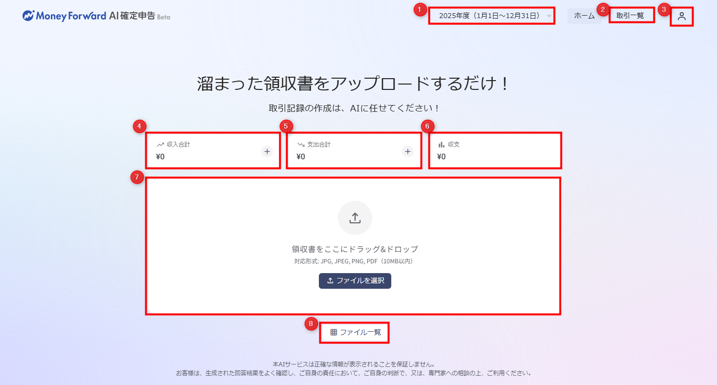 | ⑧ | ファイル一覧 | クリックすると「取引一覧」画面で手入力や領収書のアップロードで作成された取引記録を確認できます。 |