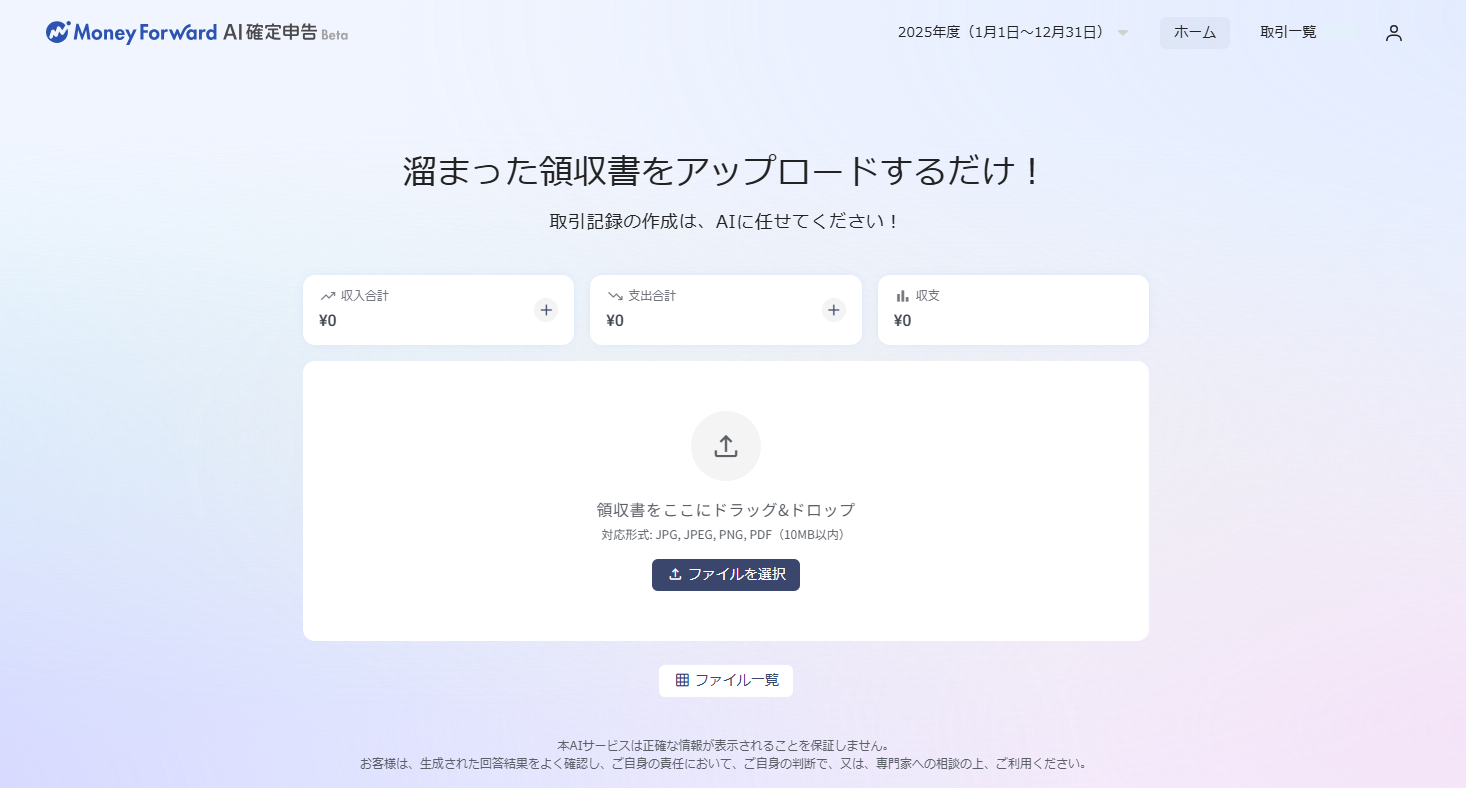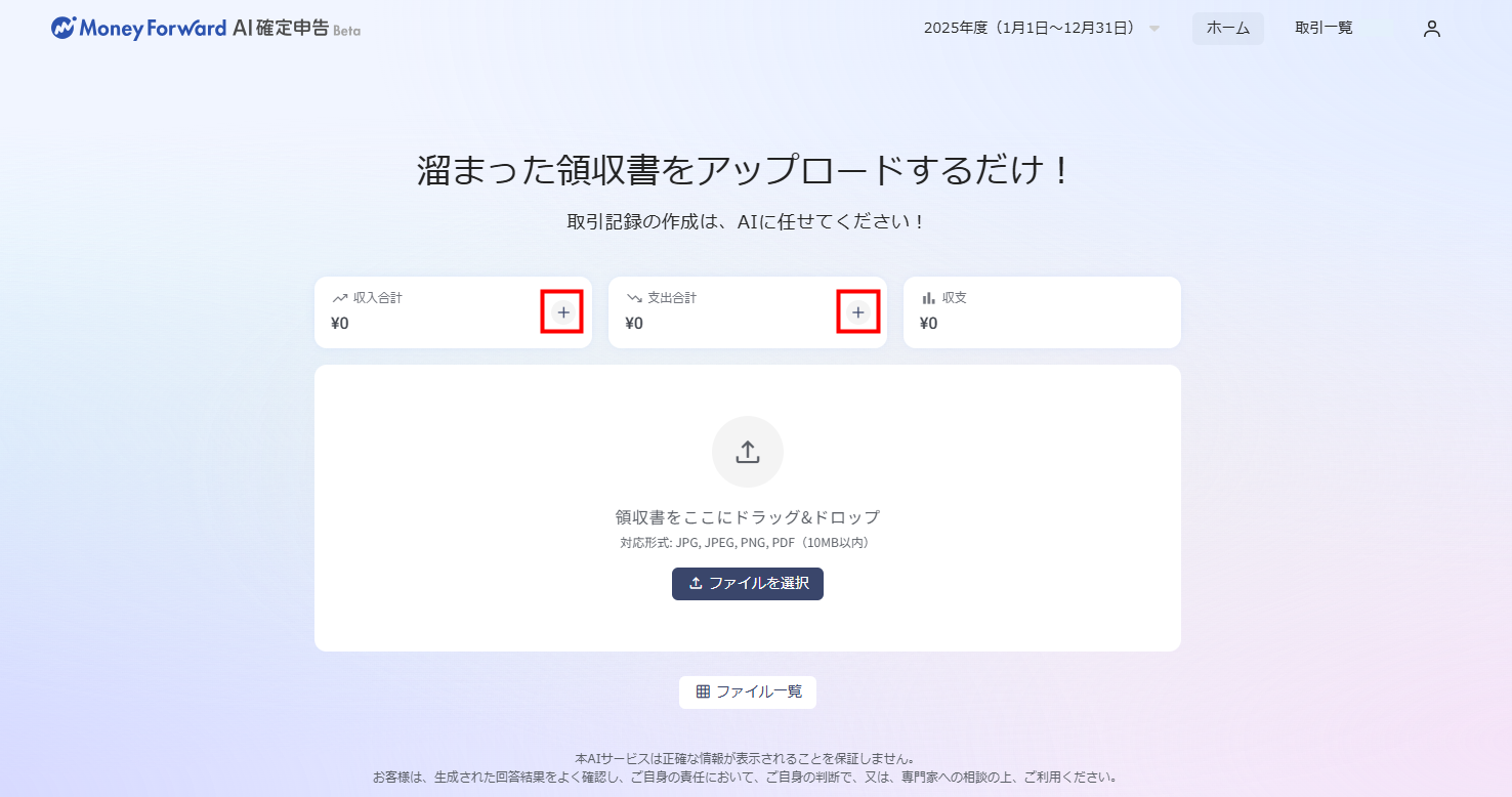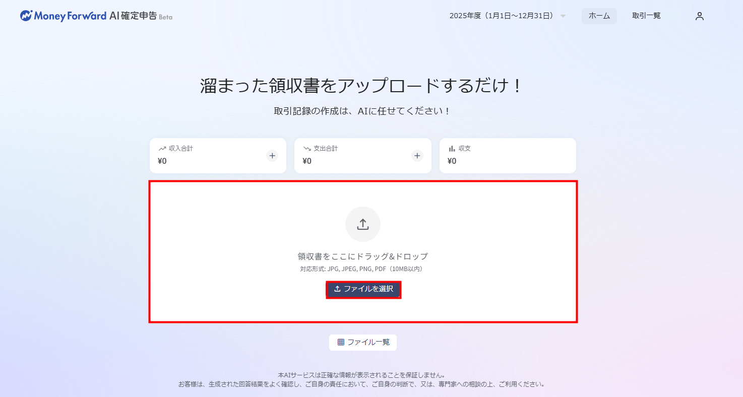 - 「ファイルを選択」をクリックしてファイルを選択するか、ファイルをドラッグ&ドロップして領収書データをアップロードします。