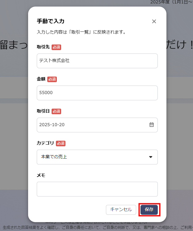 - 「手動で入力」画面で「取引先」「金額」「取引日」「カテゴリ」を入力し、「保存」をクリックします。