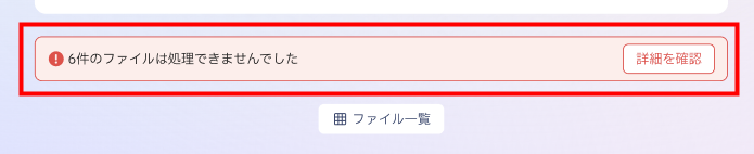 アップロードできなかった場合、画面下部に「●件のファイルは処理できませんでした」というメッセージが表示されます。