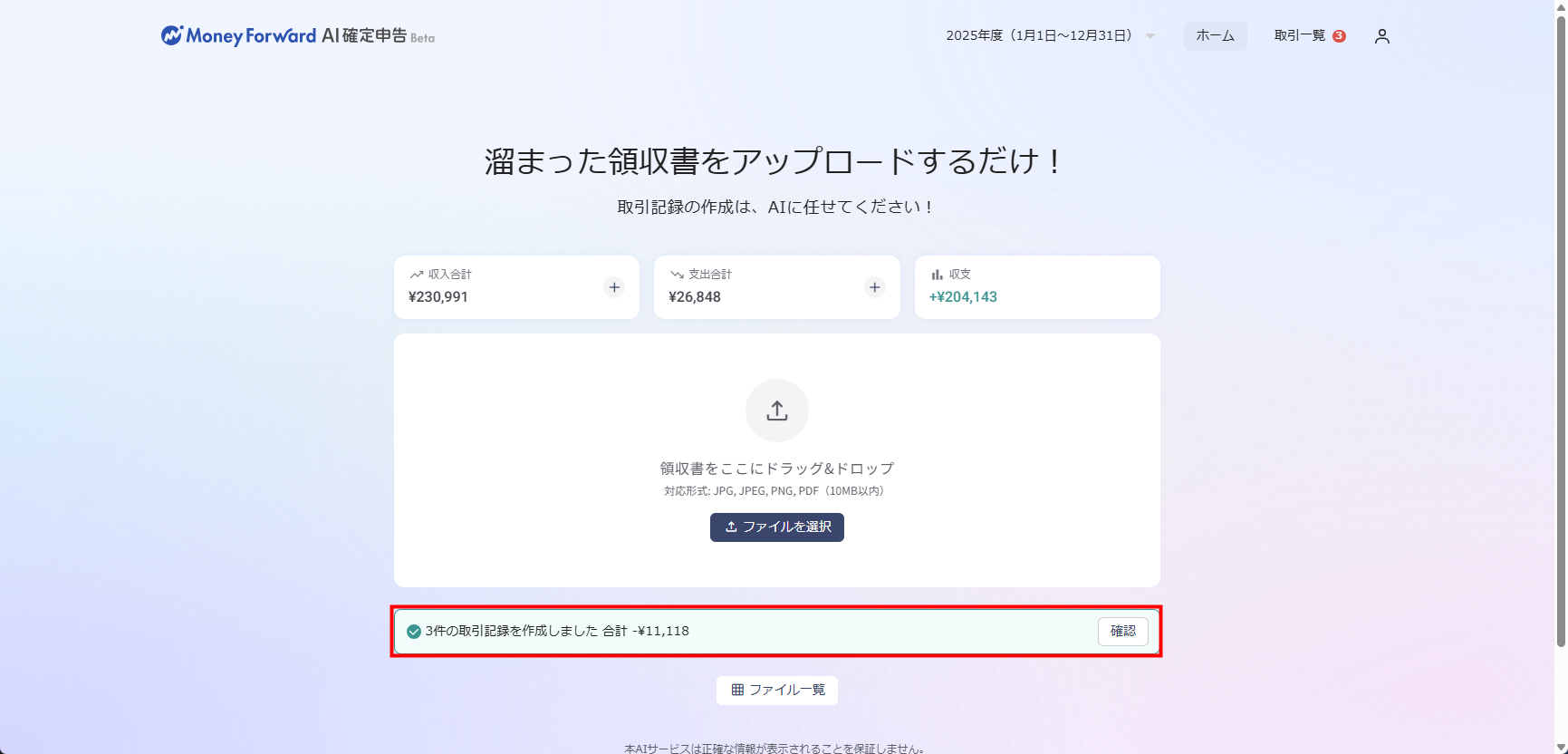 - 画面下部に「●件の取引記録を作成しました」というメッセージが表示されたことを確認します。