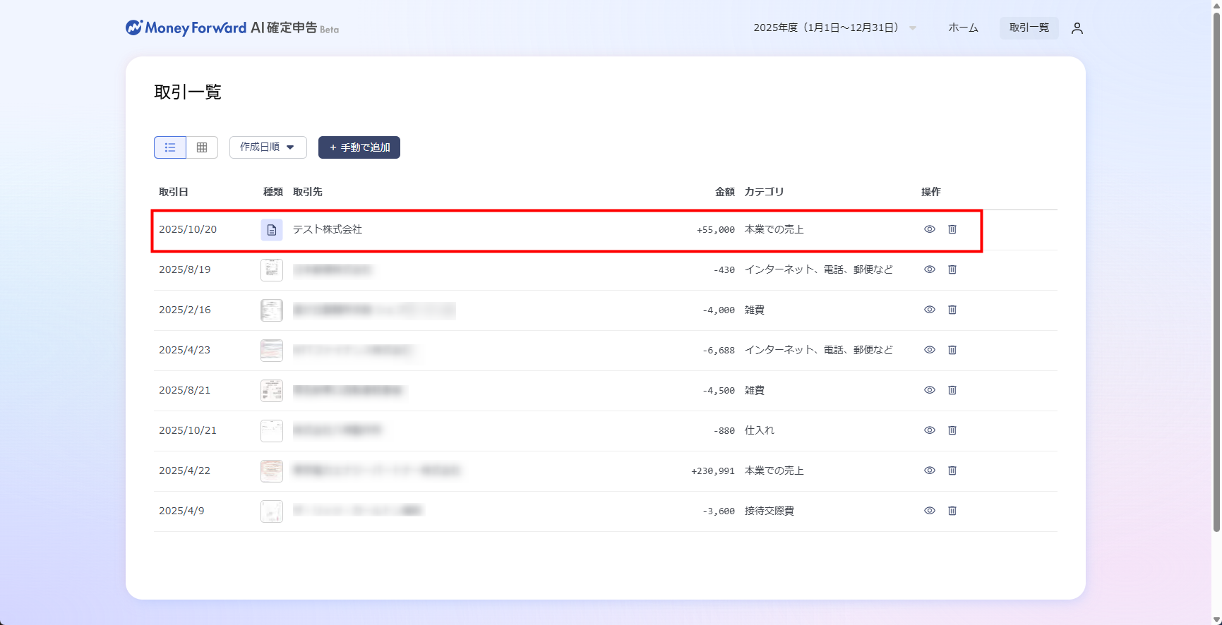 - 「取引一覧」画面で対象の取引記録が表示されたことを確認します。
