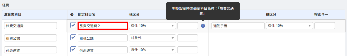 - 「旅費交通費」が表示されたことを確認し、左側のチェックボックスにチェックを入れます。