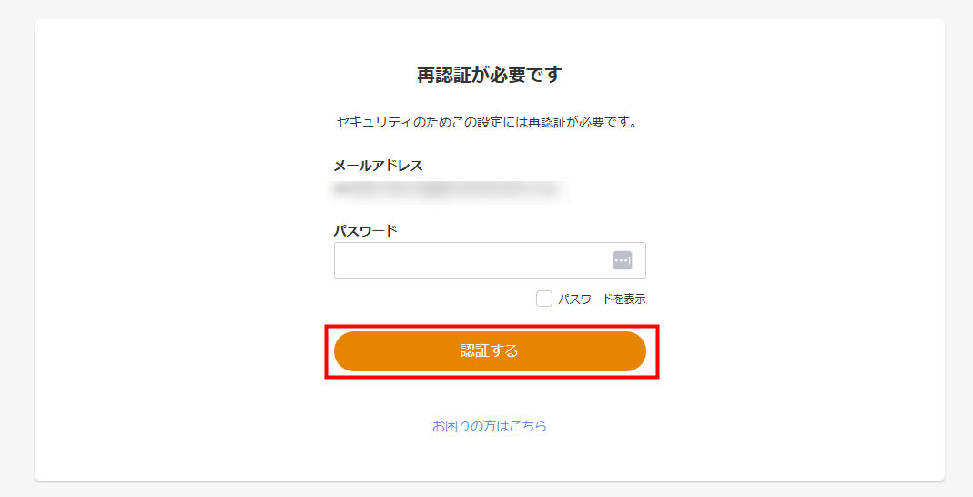 - 「再認証が必要です」画面で「パスワード」を入力し、「認証する」をクリックします。
