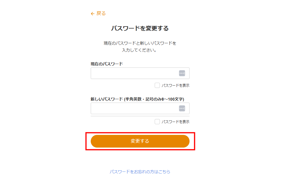 - 「パスワードを変更する」画面で「現在のパスワード」と「新しいパスワード」を入力し、「変更する」をクリックします。