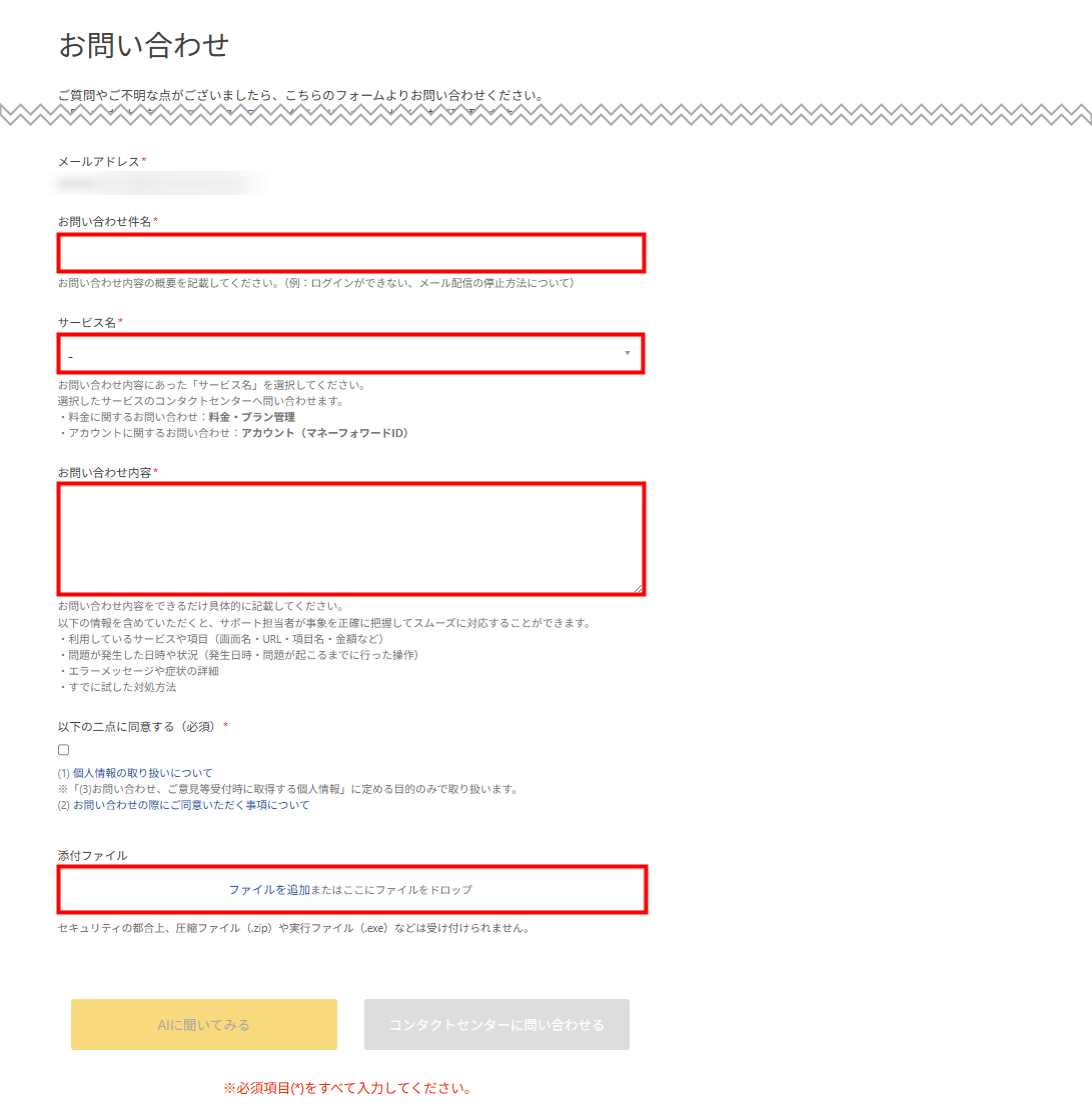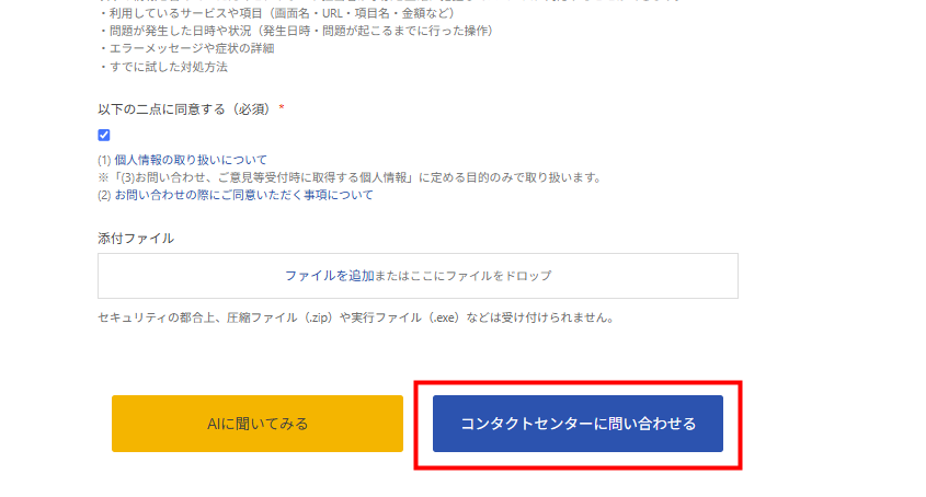 - 入力内容に誤りがないかを確認し、問題がなければ「コンタクトセンターに問い合わせる」をクリックします。