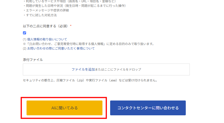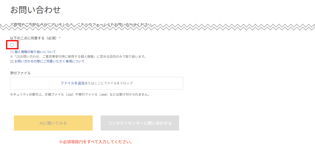 - 「個人情報の取り扱いについて」と「お問い合わせの際にご同意いただく事項について」を確認し、「以下の二点に同意する(必須)」にチェックを入れます。