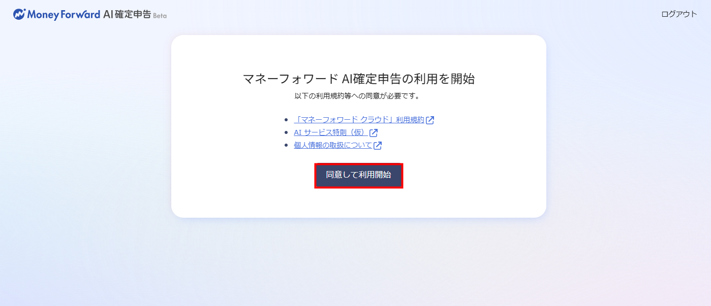 - 「利用規約」「AI サービス特則(仮)」「個人情報の取扱について」を確認し、問題がなければ「同意して利用開始」をクリックします。