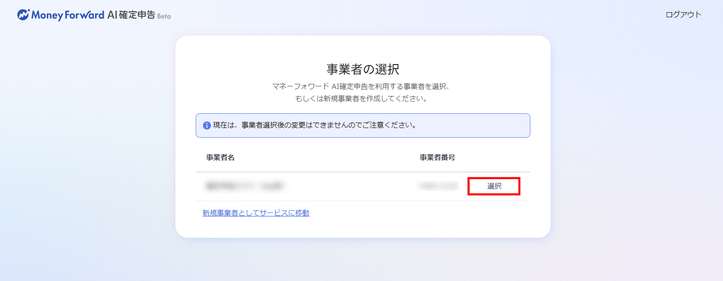 「事業者の選択」画面には、ログインしたアカウントに紐づく「個人事業主」の事業者が表示されます。