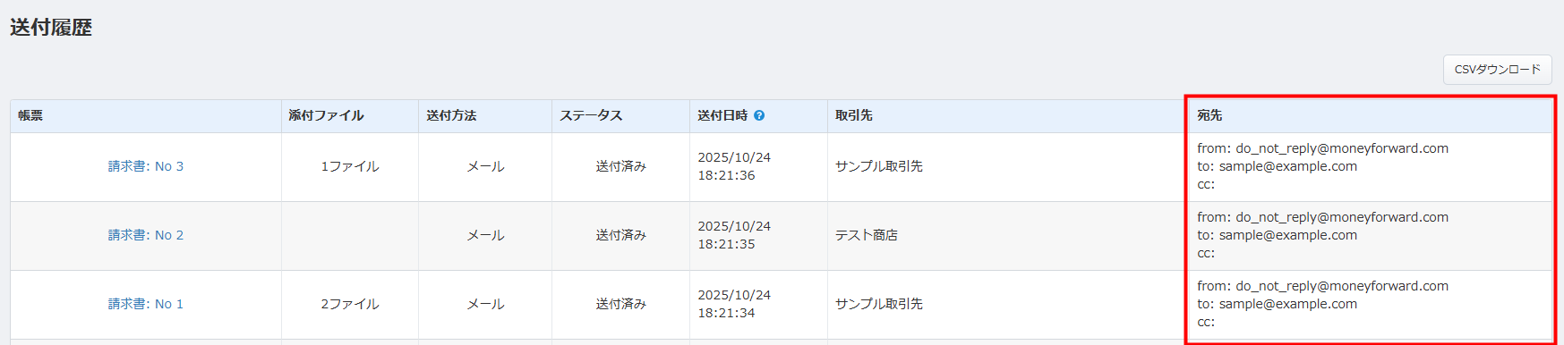 設定したメールアドレスは、「送付履歴」画面の「宛先」で確認してください。