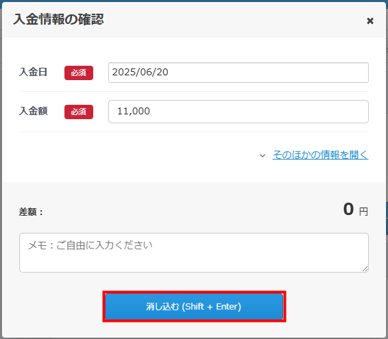 - 「入金情報の確認」画面で正しい入金日を指定し、「消し込む (Shift + Enter)」をクリックします。
