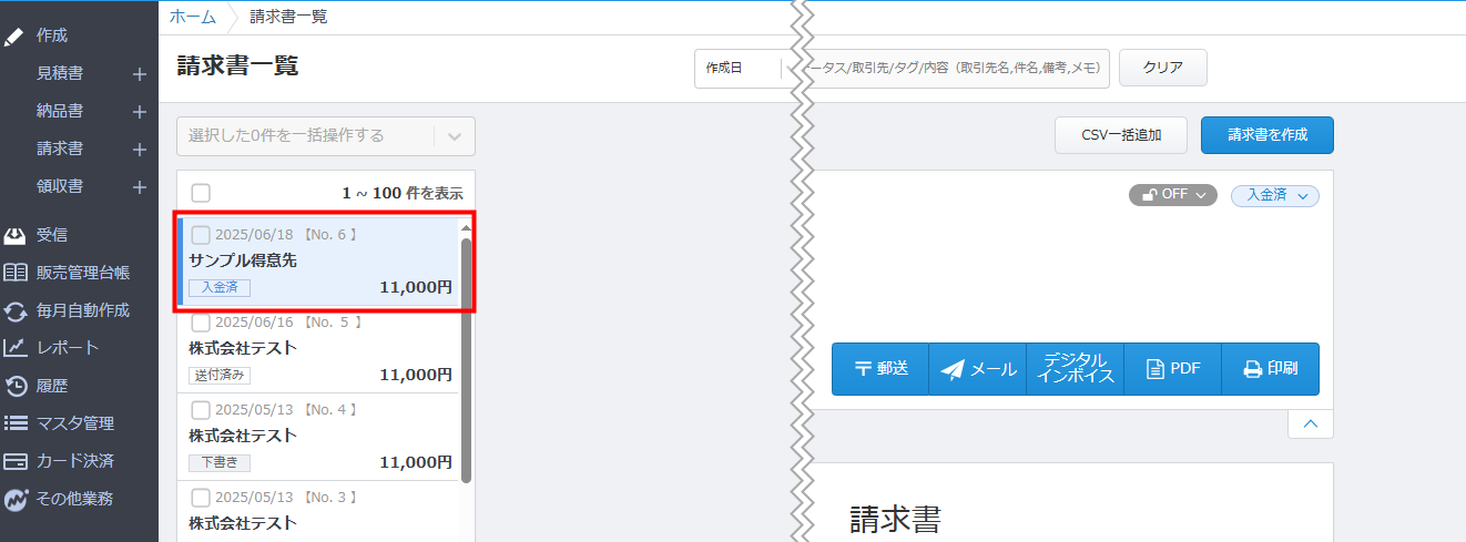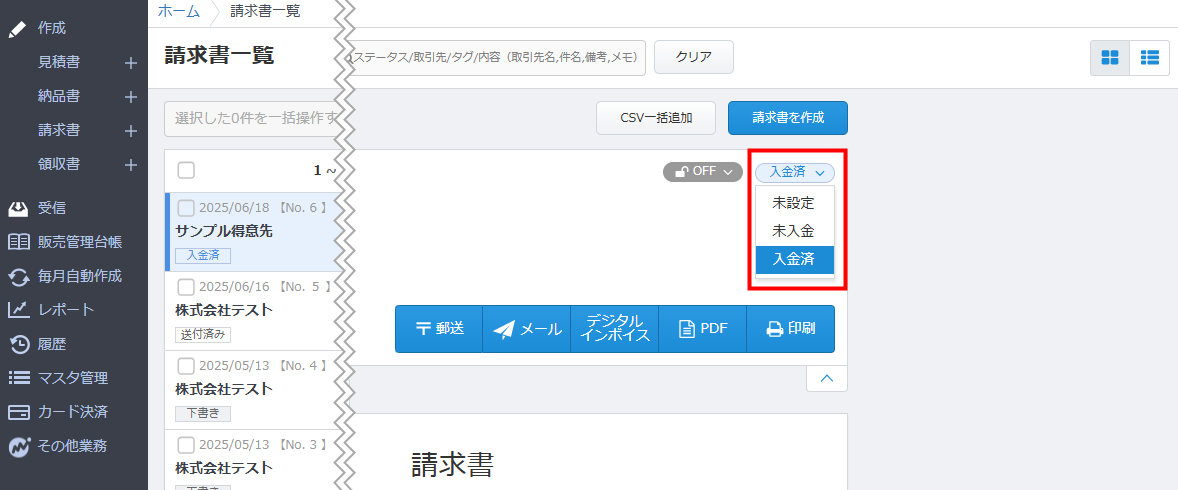- 「請求書一覧」画面で入金日を変更する請求書を選択します。