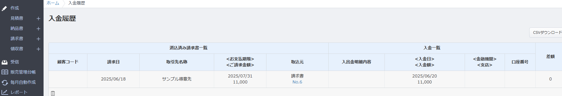 - 「入金履歴」画面で登録した入金情報を確認します。