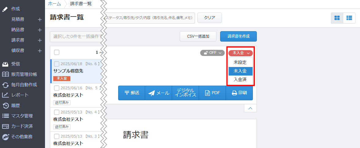 - プレビューの右上にある「入金済」のプルダウンをクリックし、「未入金」を選択します。